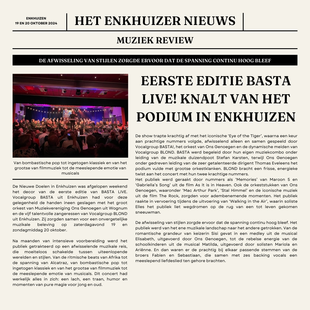 Vocalgroup BASTA! uit Enkhuizen had voor deze gelegenheid de handen ineengeslagen met het groot orkest van Muziekvereniging Ons Genoegen uit Wognum en de vijf talentvolle zangeressen van Vocalgroup Blond uit Enkhuizen.